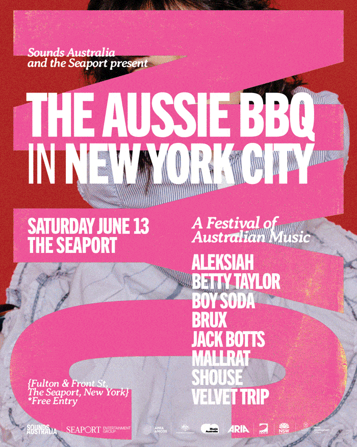 Since 2009, Sounds Australia has been showcasing exciting new Australian talent to New York audiences, with THE AUSSIE BBQ evolving across the city from CMJ Music Marathon to SummerStage and now its newest home at the Seaport. Artists such as RÜFÜS DU SOL, Amyl and the Sniffers, Courtney Barnett, Vance Joy, Ecca Vandal, The Temper Trap, DMA’S, Emma Louise, Flume, G Flip, Gordi, The Teskey Brothers and Tkay Maidza have previously performed at THE AUSSIE BBQ.